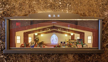 「ショーケースの中を礼拝堂のようにしたい」とのご依頼で、ジョイ設計の得意とするデザインをベースに、クリスマスシーズンの商品等を飾るショーウィンドウの制作をしました。印刷パネルで柱・梁・壁などの構造を、そして十字架や照明器具のミニチュアなどもオリジナルで手作りし、エレベーター扉のデザインと揃えたイラストを投影。キリスト教の建物らしく、クリスマスの物語をお届けできる温かみのあるデザインを目指しました。