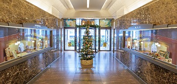 「ショーケースの中を礼拝堂のようにしたい」とのご依頼で、ジョイ設計の得意とするデザインをベースに、クリスマスシーズンの商品等を飾るショーウィンドウの制作をしました。印刷パネルで柱・梁・壁などの構造を、そして十字架や照明器具のミニチュアなどもオリジナルで手作りし、エレベーター扉のデザインと揃えたイラストを投影。キリスト教の建物らしく、クリスマスの物語をお届けできる温かみのあるデザインを目指しました。